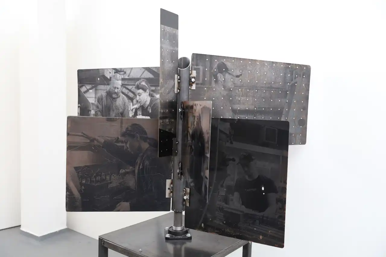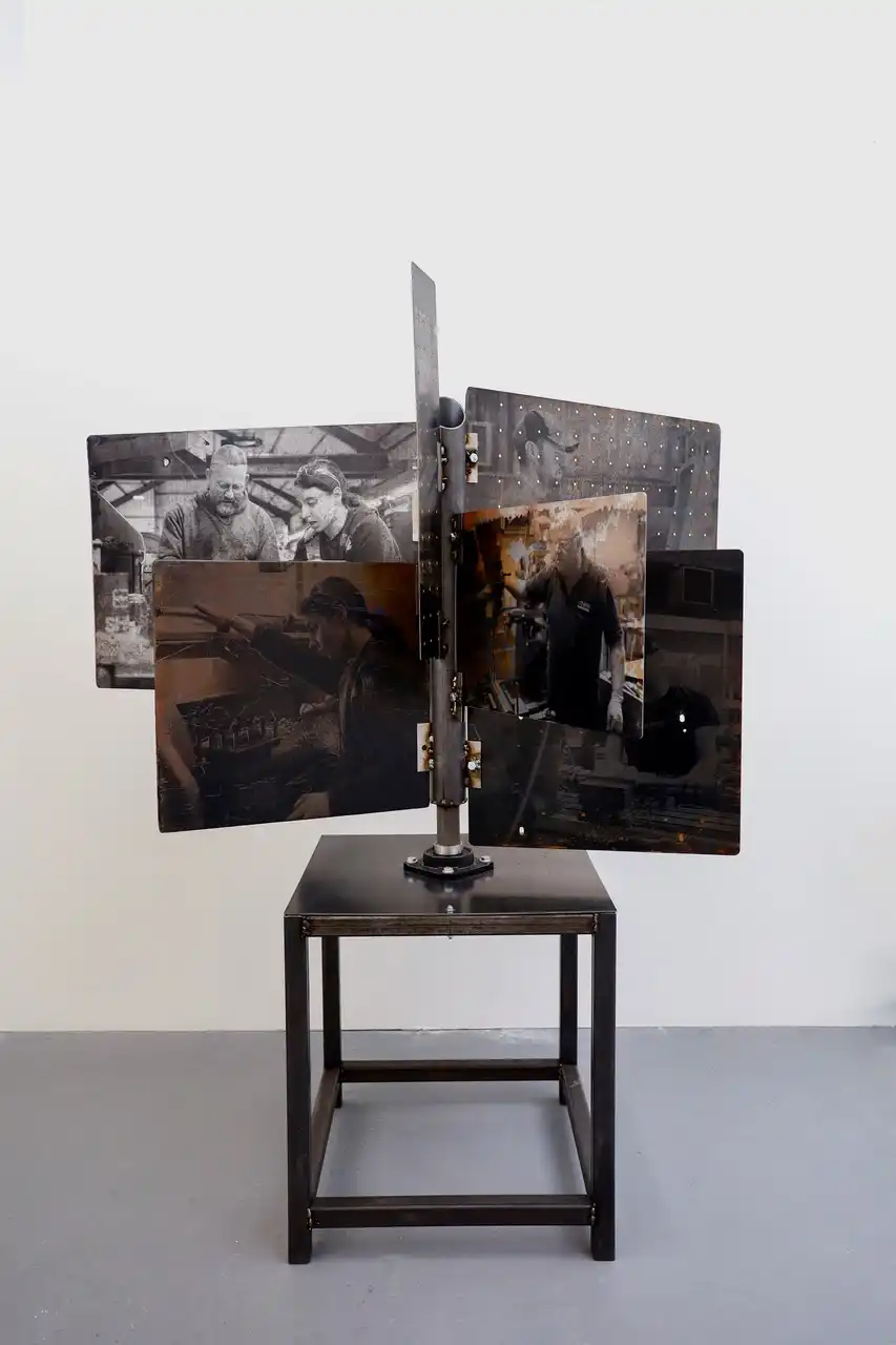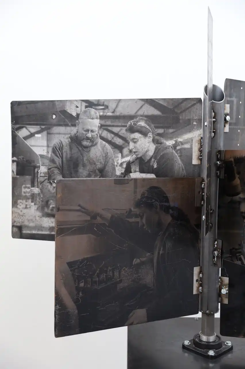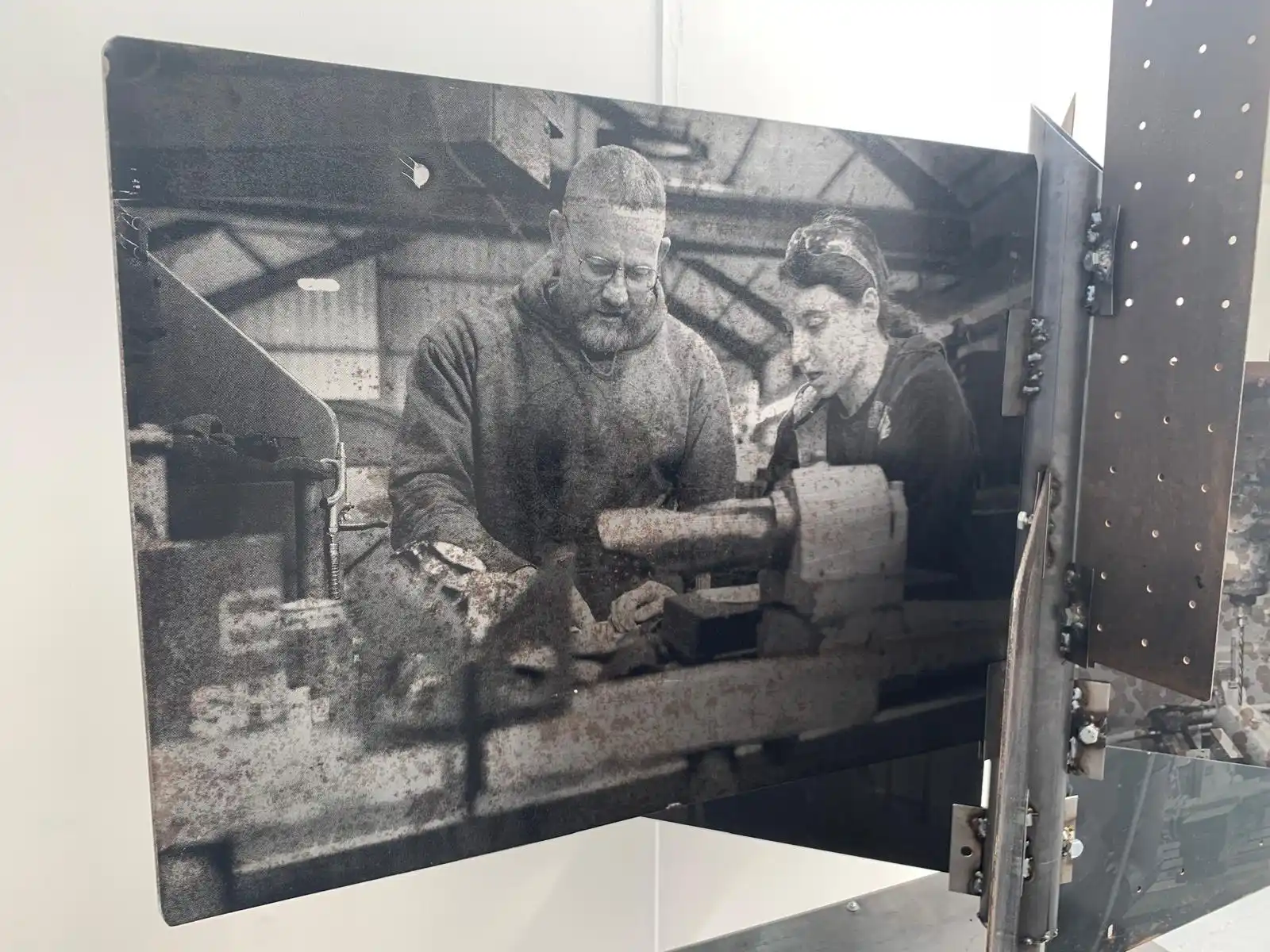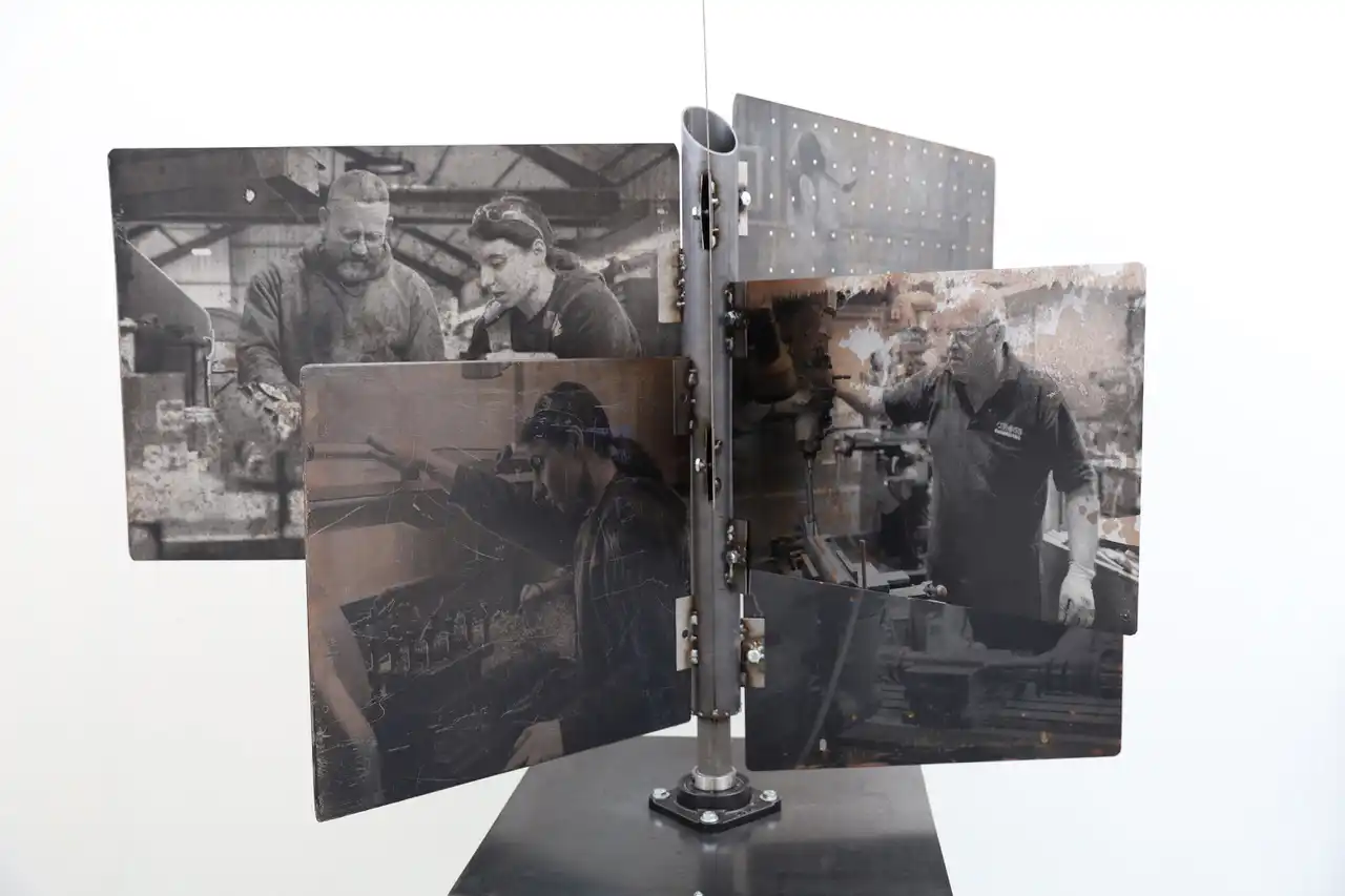 The main piece consisting of the stand with the images screen printed had the main title of “Gwaith Taclus” (Precision Work). The word “taclus” can also be translated as “tidy” which is commonly used in South Wales with affectionate connotations. The piece was constructed entirely from steel at the college Metal Workshop and designed to reflect the interconnectivity of the materials and the workforce depicted thereon. These were photographs taken by myself of the engineers and fabricators at the plant in Swansea and screen printed onto the metal sheets, the sheets having been salvaged from the outside area of the works and then cleaned with polish. Positioned in such a way to reflect the reading of a book and marked with a central bookmark to reflect the importance of manual skilled work. Going forward and upon reflection, had there been a larger area this would have been positioned more centrally to allow viewers to walk around and observe from various angles and where the natural lighting from the high ceilings would have had more effect.