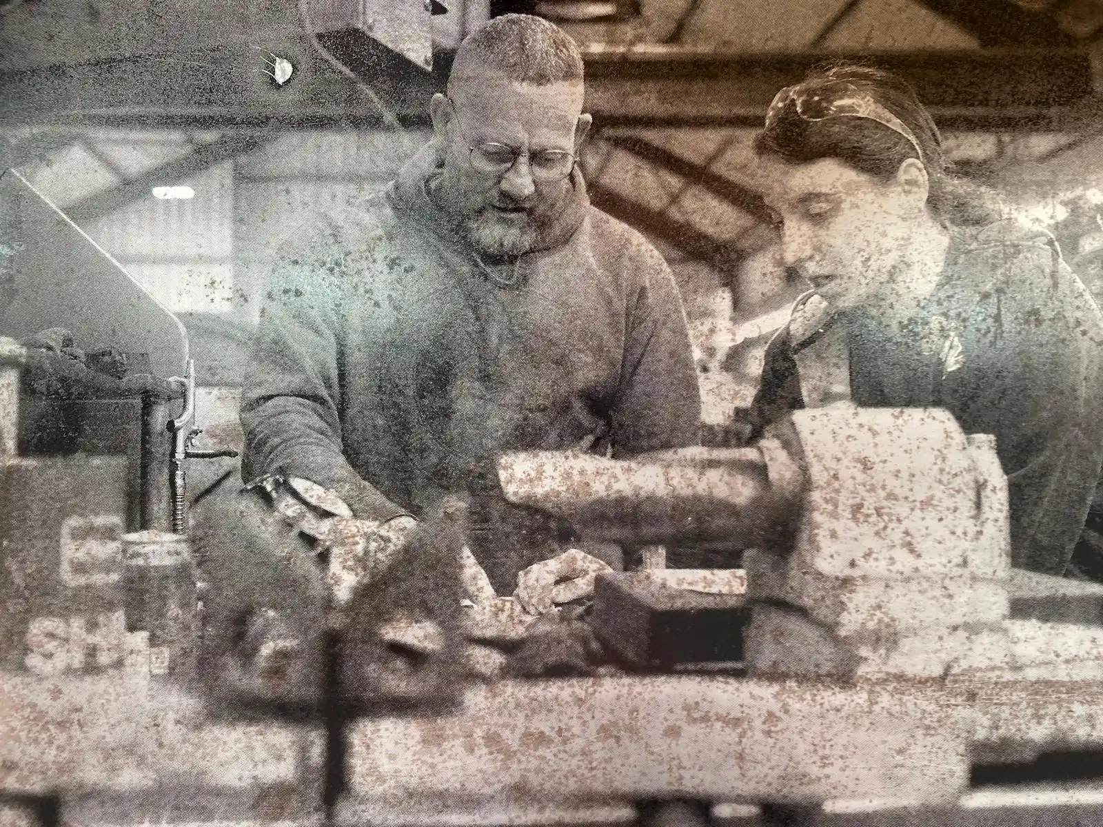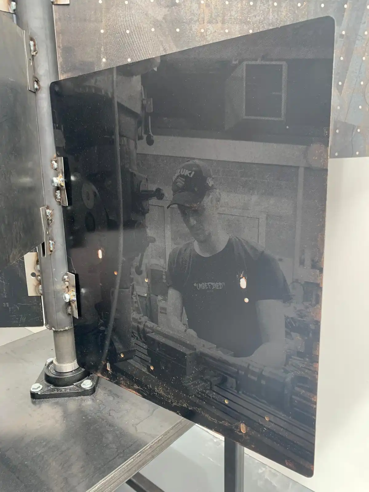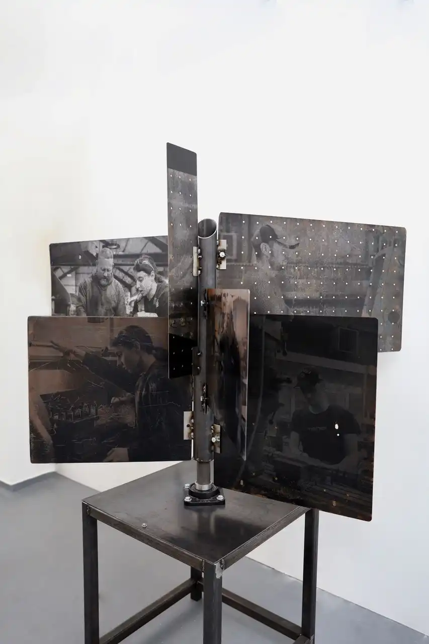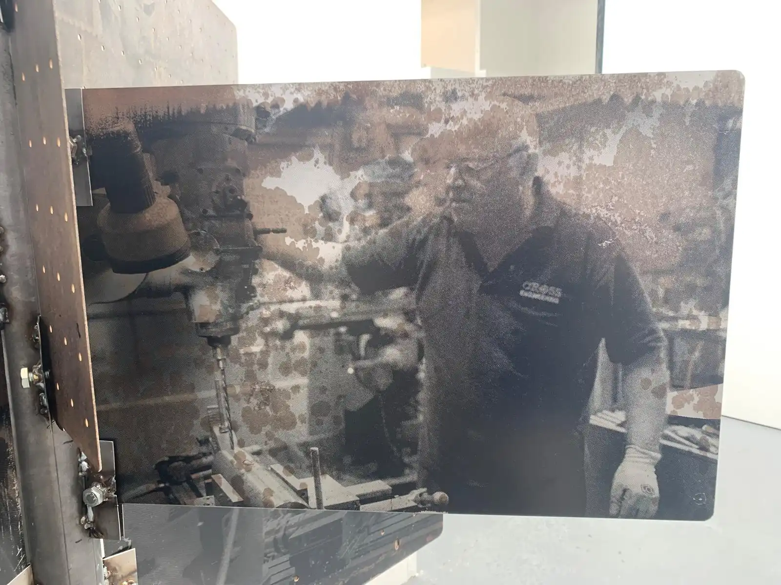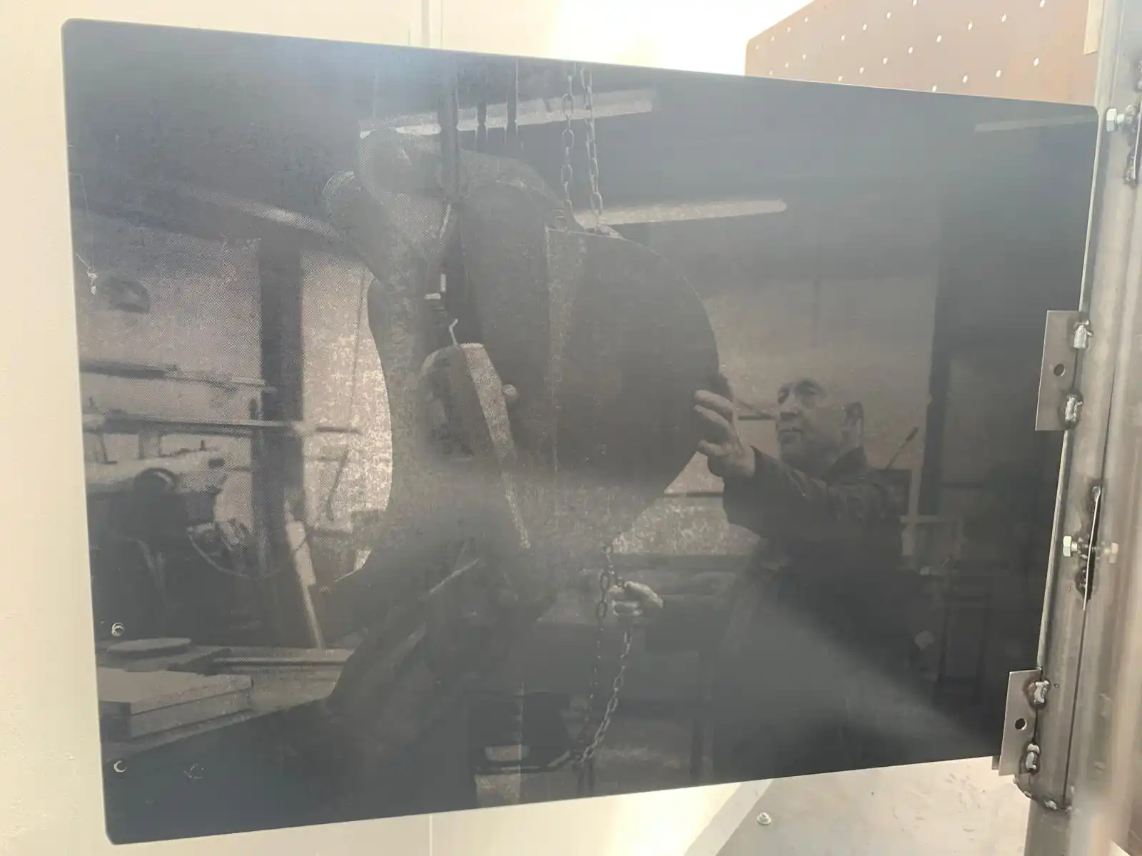 The main piece consisting of the stand with the images screen printed had the main title of “Gwaith Taclus” (Precision Work). The word “taclus” can also be translated as “tidy” which is commonly used in South Wales with affectionate connotations. The piece was constructed entirely from steel at the college Metal Workshop and designed to reflect the interconnectivity of the materials and the workforce depicted thereon. These were photographs taken by myself of the engineers and fabricators at the plant in Swansea and screen printed onto the metal sheets, the sheets having been salvaged from the outside area of the works and then cleaned with polish. Positioned in such a way to reflect the reading of a book and marked with a central bookmark to reflect the importance of manual skilled work. Going forward and upon reflection, had there been a larger area this would have been positioned more centrally to allow viewers to walk around and observe from various angles and where the natural lighting from the high ceilings would have had more effect.