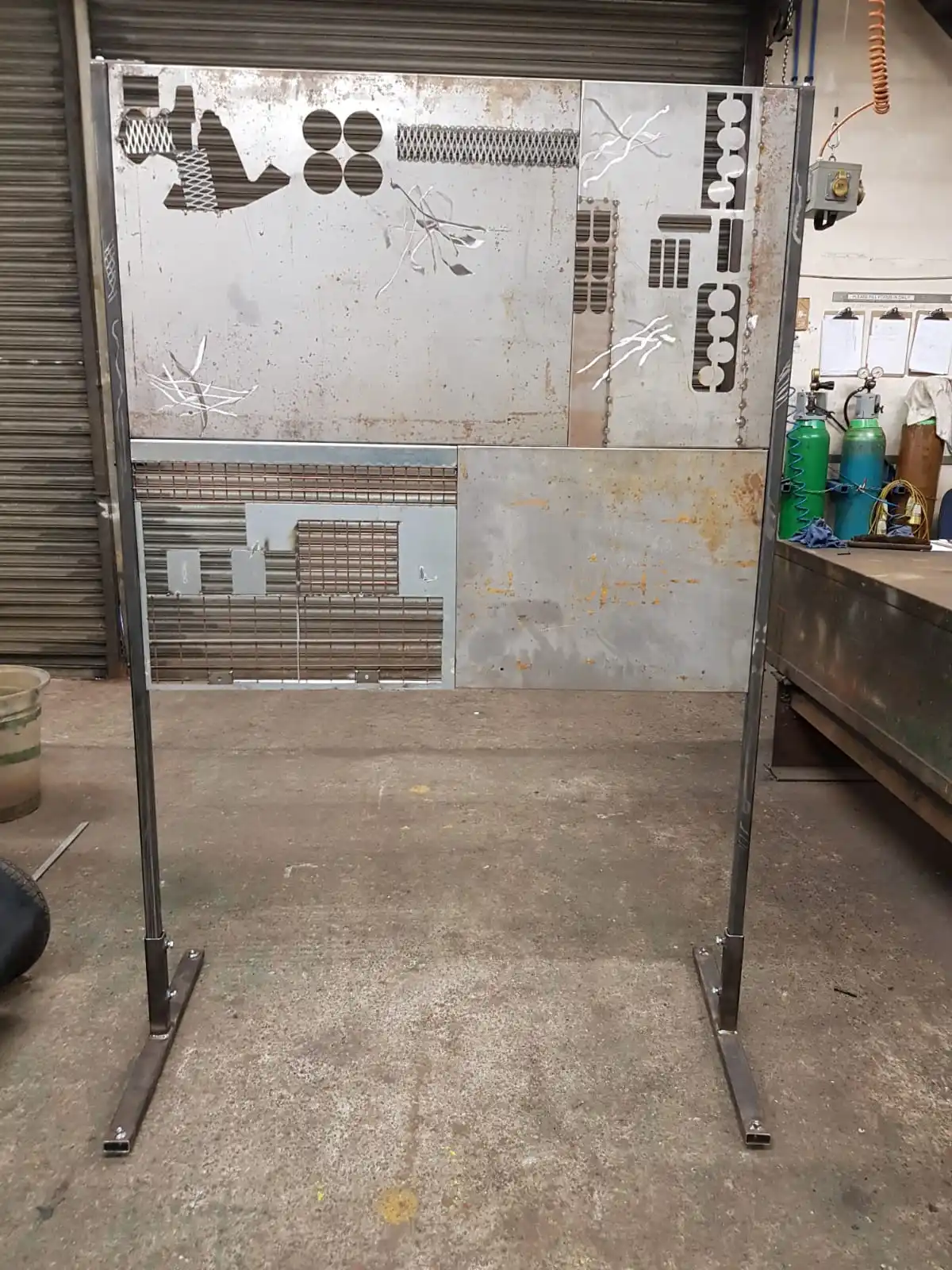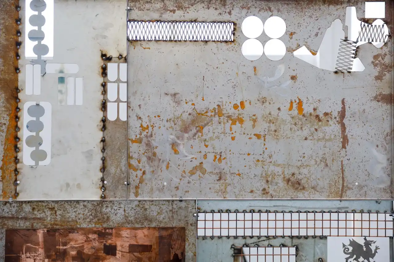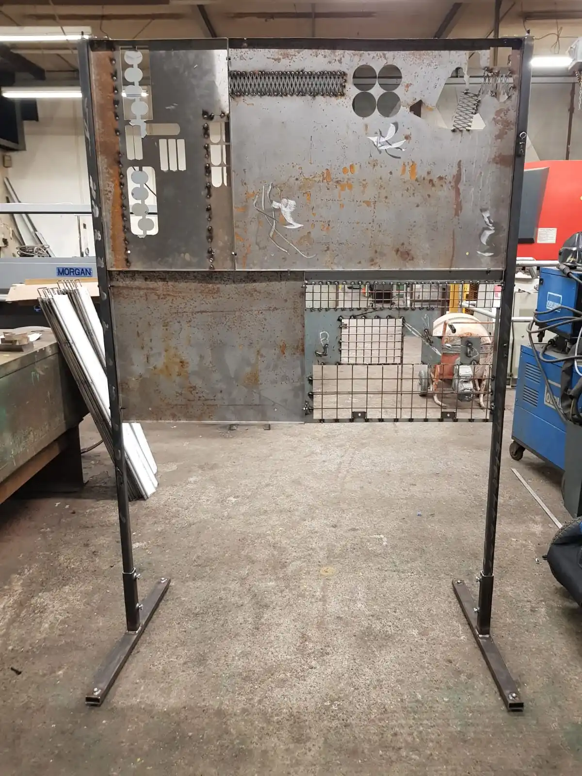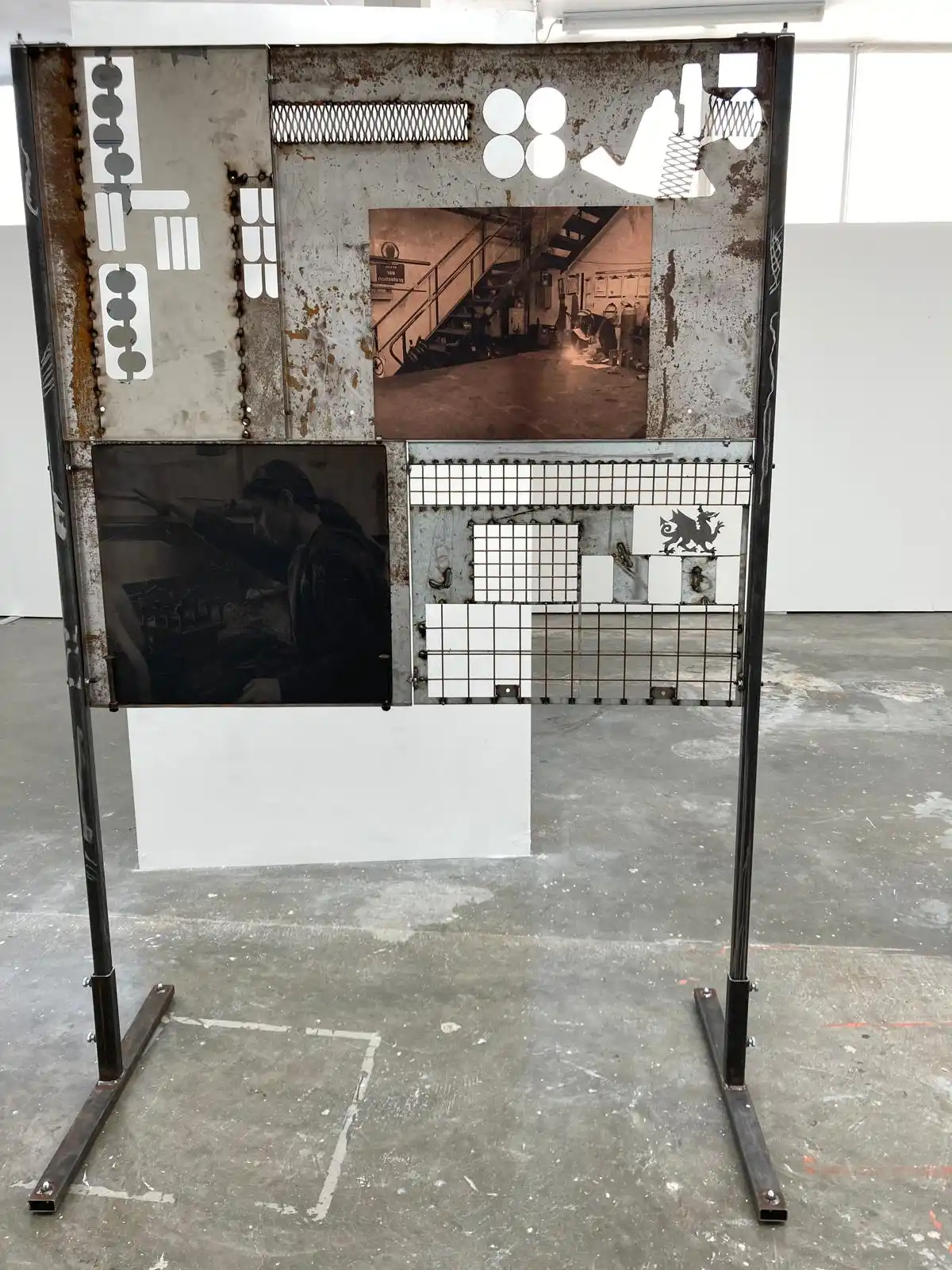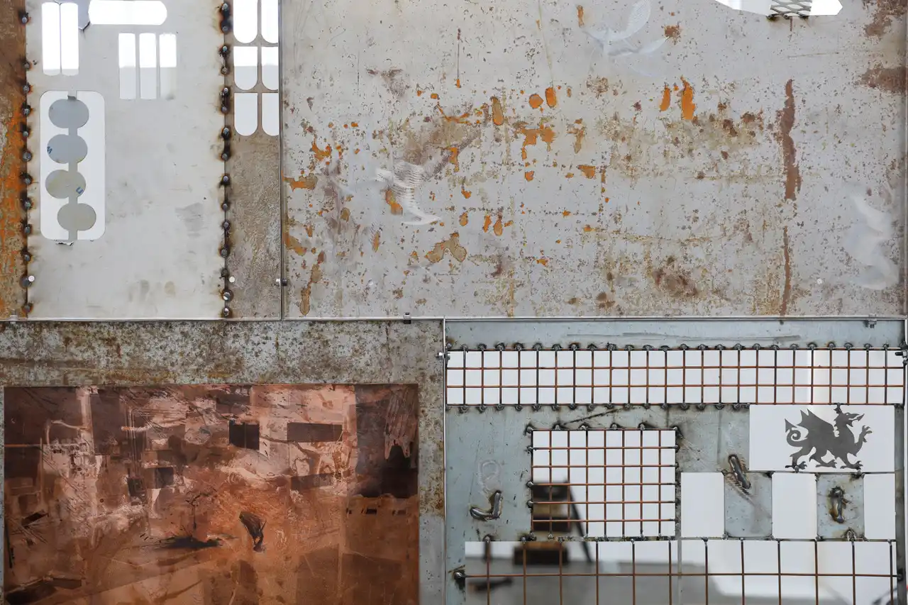 Visits to the engineering site in Swansea led me to the proposal of the construction of a sculptural piece which resembled a fire retardant screen used by the fabricators during the welding process. I wanted the piece which was made entirely on site with cut-offs/salvaged material to reflect the relevance to the operatives themselves. The pieces themselves have all been returned to the site and where future pieces will be mounted. The fabricators themselves have been encouraged to interact with the piece by placing their own work thereon. This was a main purpose/theme for myself in constructing the piece “in house” and has served in celebrating and acknowledging the employees. I also produced a number of paper prints which were gifted to the site along with three framed photographic prints which have now been displayed in their conference room.