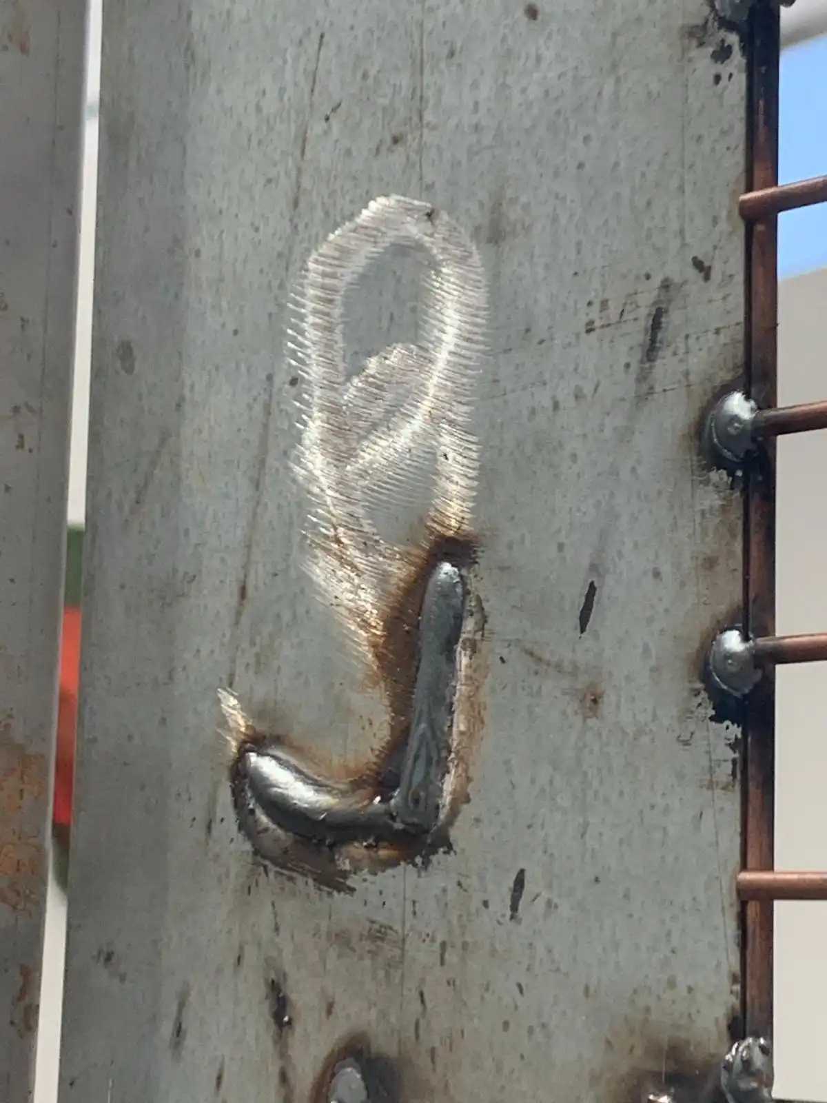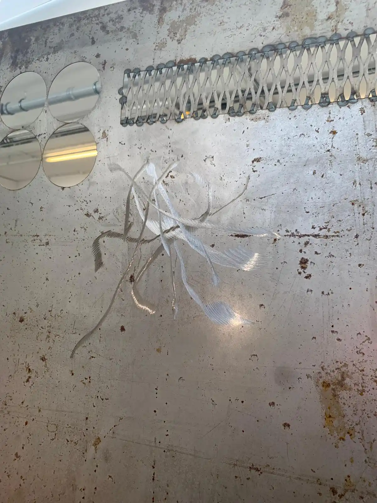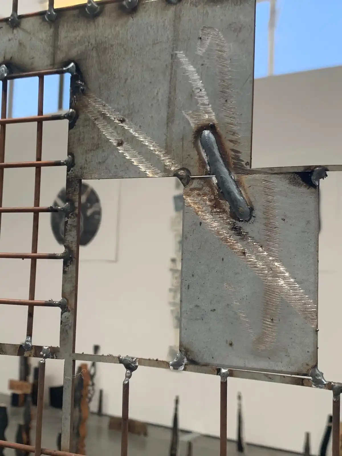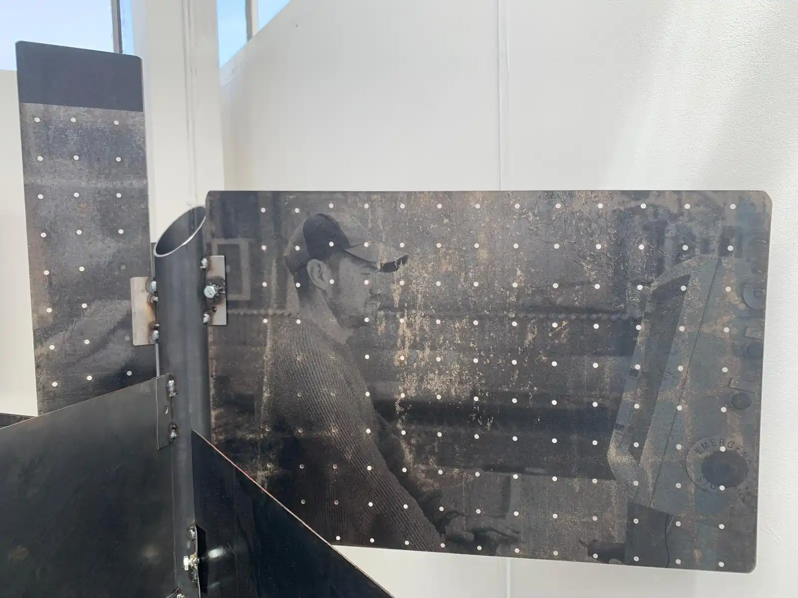 Visits to the engineering site in Swansea led me to the proposal of the construction of a sculptural piece which resembled a fire retardant screen used by the fabricators during the welding process. I wanted the piece which was made entirely on site with cut-offs/salvaged material to reflect the relevance to the operatives themselves. The pieces themselves have all been returned to the site and where future pieces will be mounted. The fabricators themselves have been encouraged to interact with the piece by placing their own work thereon. This was a main purpose/theme for myself in constructing the piece “in house” and has served in celebrating and acknowledging the employees. I also produced a number of paper prints which were gifted to the site along with three framed photographic prints which have now been displayed in their conference room.