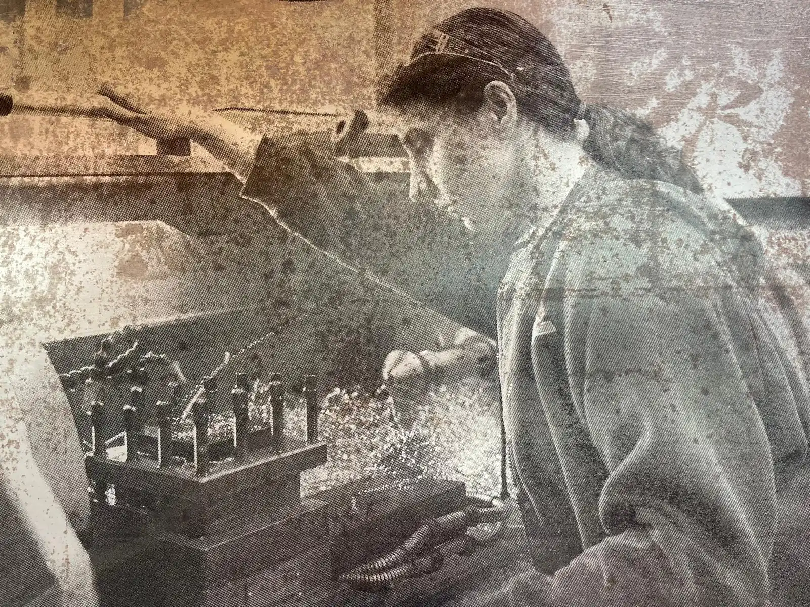The piece “Balchder yn ei waith” which appeared on “Gwersi mewn Chwarae” was created from a salvaged piece of copper (40x50cm) at the Swansea works and was heavily marked from weathering and tarnishing, having been salvaged from the outside yard area. The photograph of a fabricator was printed on by means of screen etch resist and retained as the finished piece itself. The use of copper in this instance was a reference/celebration of the copper industry in Swansea, “Copperopolis” being a historical nickname for Swansea, and which was the world’s leading copper smelting centre in the 18th and 19th centuries. This is referred to elsewhere in the website and the result of research at Swansea museum and the excellent book “Copperopolis: Landscapes of the Early Industrial Period in Swansea” by Stephen Hughes, originally published in 2001 and published by the Royal Commission on the Ancient and Historical Monuments of Wales (ISBN-10 1871184177).