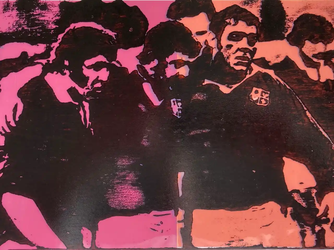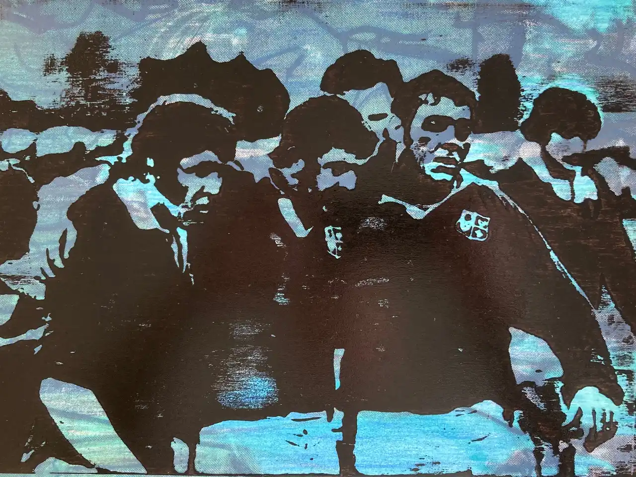 In terms of identity rugby has always played a part in establishing Wales as a nation and particularly so in confronting the old adversary England which has historically always been regarded as the oppressor. The photograph was obtained from a visit to Pontypool RFC in Gwent and depicts the Pontypool Front Row all of whom were from the local area and all of whom represented Wales and the British Lions in the 70s and early 80s, This was a period where rugby was amateur and the players all held down full time jobs, many being forced to leave their paid jobs in order to pursue tours abroad. I created the print from a laser cut from plywood and then printed onto coloured laminate sheets for a more graphic effect.
